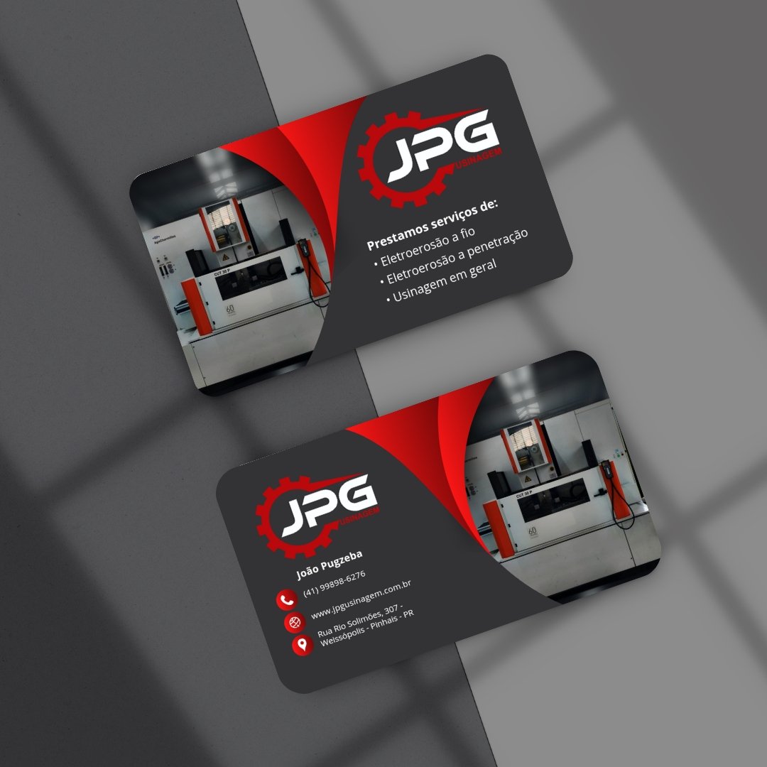 Um cartão de visita profissional, elegante e coerente com a identidade da JPG Usinagem, fortalecendo a imagem da empresa em cada apresentação comercial.