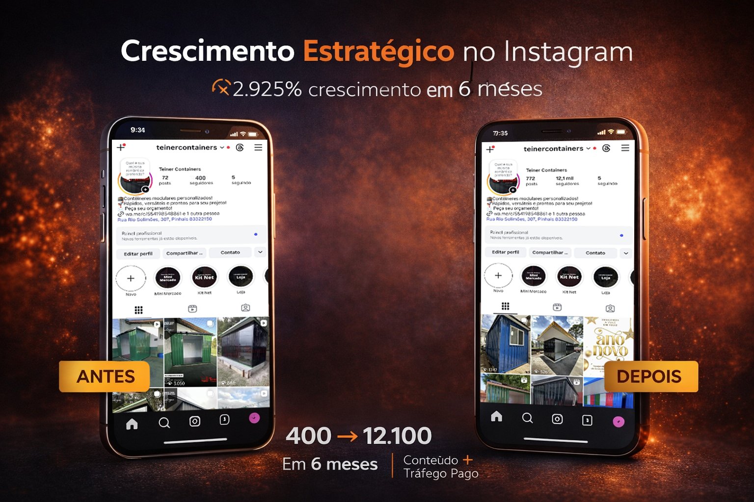 Crescimento de 400 para mais de 12,1 mil seguidores em 6 meses, com aumento expressivo de alcance, engajamento e reconhecimento de marca.